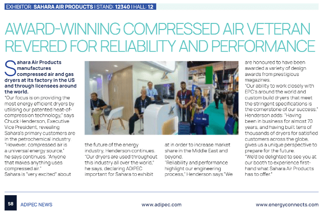 Sahara Air Products participated at ADIPEC 2024. Over 2,200 companies from across the world, representing the entire energy ecosystem and beyond, will come together at the ADIPEC Exhibition to showcase the latest strategies and innovations that are defining the future of energy. Learn more at ADIPEC 2024.